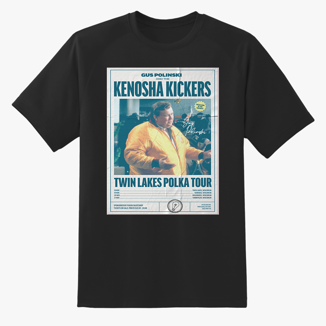 Introducing the Fixion Skate Shop “Twin Lakes Polka Tour” T-Shirt – a tribute to the unsung hero of holiday travel disasters, the polka king himself, Gus Polinski of the Kenosha Kickers. This limited-edition tee fuses Midwest skate culture with classic cinematic nostalgia. If you know, you know.